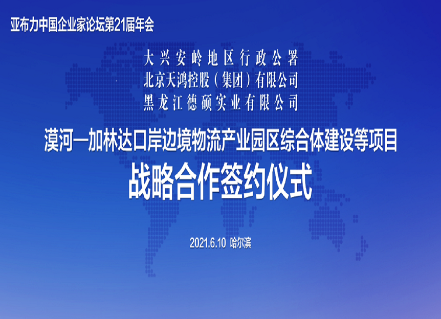 6月10日上午,漠河-加林達(dá)口岸邊境物流產(chǎn)業(yè)園區(qū)綜合體建設(shè)等項(xiàng)目戰(zhàn)略合作簽約儀式在哈爾濱舉行,大興安嶺地區(qū)行政公署與黑龍江德碩實(shí)業(yè)有限公司、北京天鴻控股(集團(tuán))有限公司三方成功簽訂合作協(xié)議。