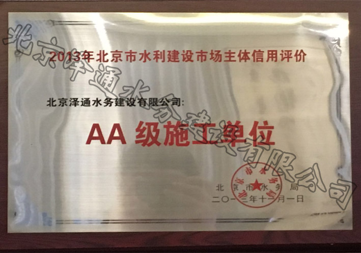 2013年北京市水利建設(shè)市場(chǎng)主體信用評(píng)價(jià)AA級(jí)施工單位